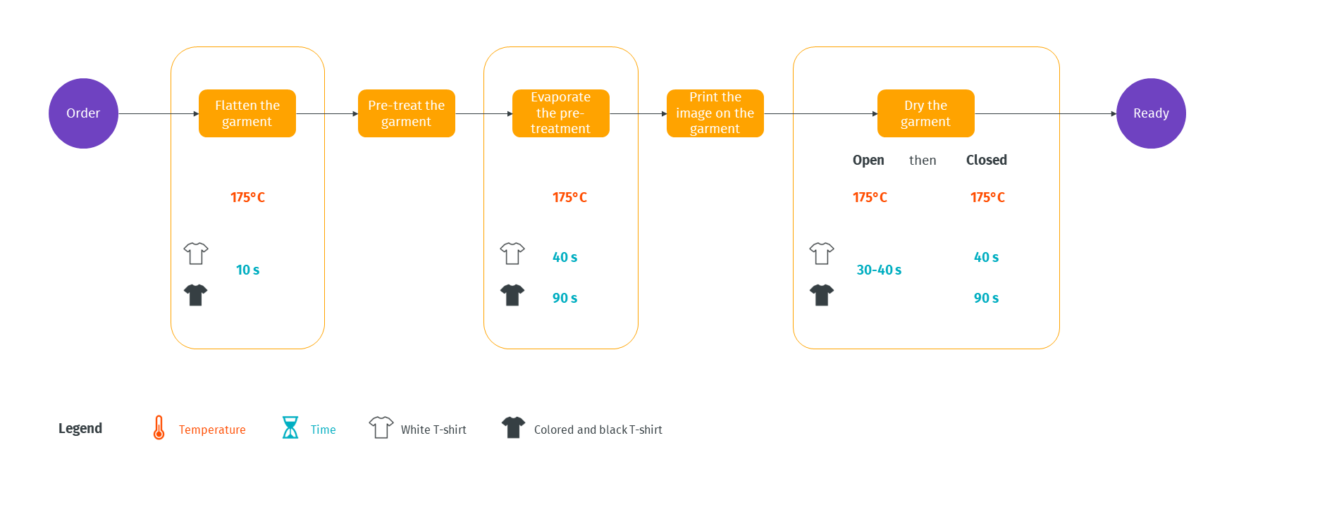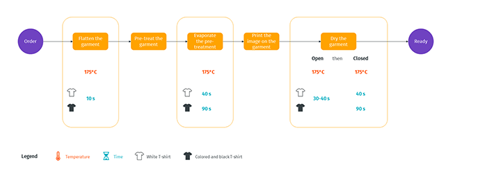 - Time: set based on the type of fabric, the thickness of the garment and ink