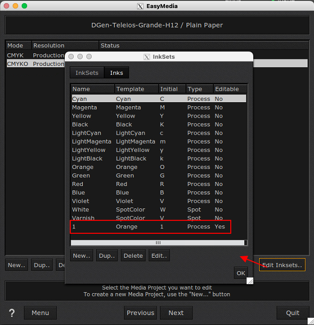 - Create the Custom Inkset (e.g., CMYKO) as your production requires it: