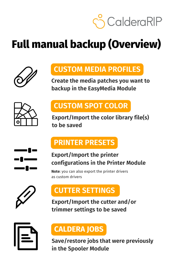 For more details, please refer to the dedicated article: How to manually backup each element of CalderaRIP?