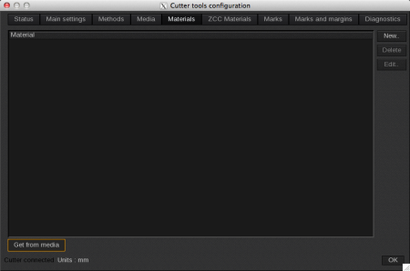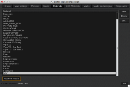 - (Optional) If the list is empty, and your drivers allow it, click on the Get from media button, which will create materials with your printer’s media names: