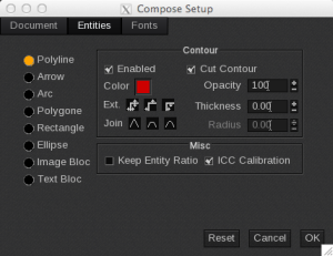 The Compose module allows you to create lines and objects for which cut contours can be generated. Contours are defined in the Compose Setup, which is accessible by clicking the Setup button in the main window and then selecting the Entities tab: