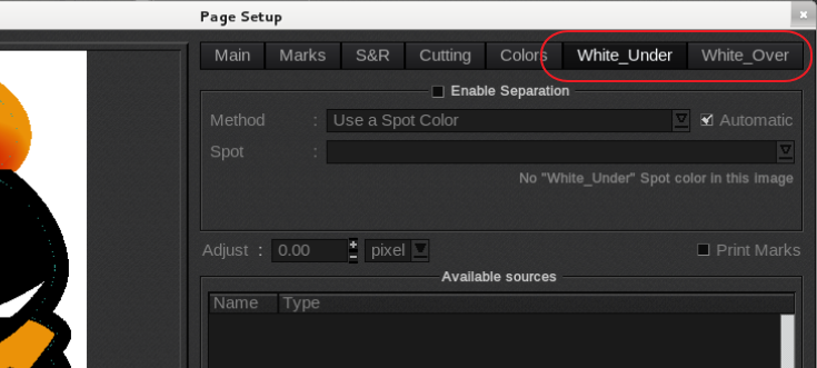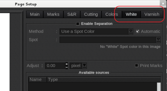 For instance, if the default ink set is changed from varnish to two whites, you can rename the page setup tabs for white and varnish separation:
