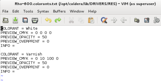 - Locate the colorant file for your specific printer. For example, for the Durst-Rho-600 printer driver, the file will be: Rho-600.colorants.txt
