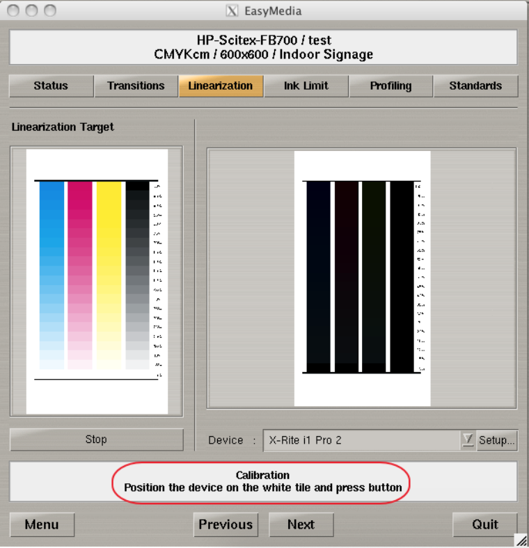 Place the i1 using the guide over the first target and press the button on the side, the i1 should briefly light up with a green light indicating a successful measurement.