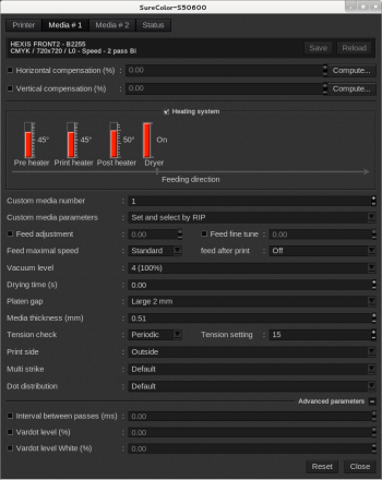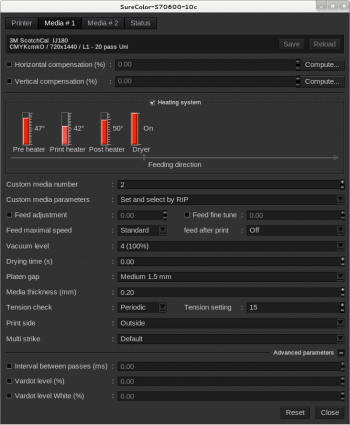 - Feed adjustment (%): this setting can be used in case of banding issues (horizontal striped lines or uneven colors) because of media strech. You can enter values from -1 to 1.53%