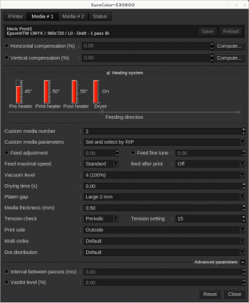 - Tension check: by default, the printer checks the media tension: every 5 meters (Periodic) or at the end of the job (Every Page). It slows the print a little bit but maintain a good media feed.