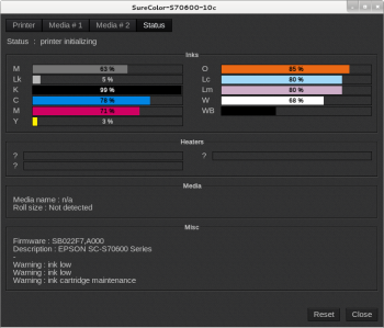 - Inks: information about the ink configuration and the inks levels in %.