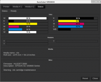 - Inks: Inks and Waste Boxes levels