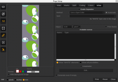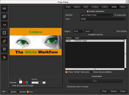 To use the Special inks, you must enable at least one special ink separation in the Page Setup of the Print module (White or Silver tab), and select the appropriate separation method to use the special ink. Only 8 colors drivers have a Silver tab.