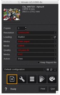 - Save: when you click on this button, the current media settings are saved to the selected media profile (printer, media, resolution, mode) so they will be applied for any new job using the same print configuration. If you don't save, the changes you made are only applied to the current job.