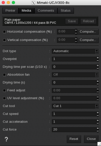 - Vertical compensation (%): this can be useful if you detect an increase or decrease in the length due to heating or media tension which is common when printing on vinyl or textiles for example. To calculate the compensation, click Compute and follow the software’s instructions.