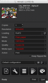 The Mimaki UJV55 drivers support up to four media types: Tarpaulin, PVC, Film, and FF, according to the selected resolution and quality combination.