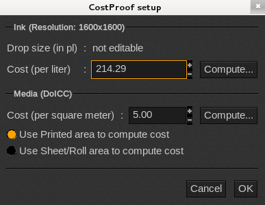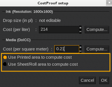 - To compute the cost of your media you can either choose "Use Printed area to compute cost" or " Use sheet/Roll area to compute cost".