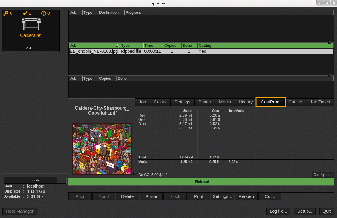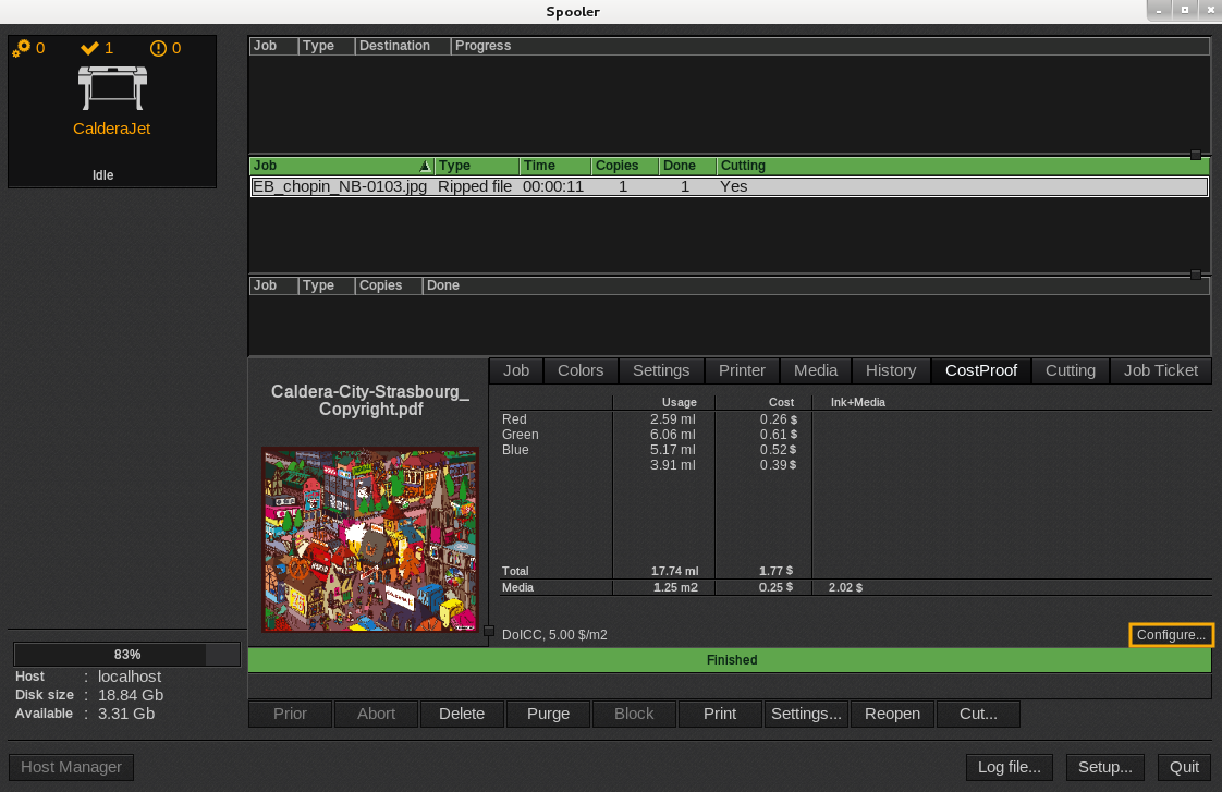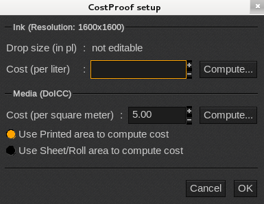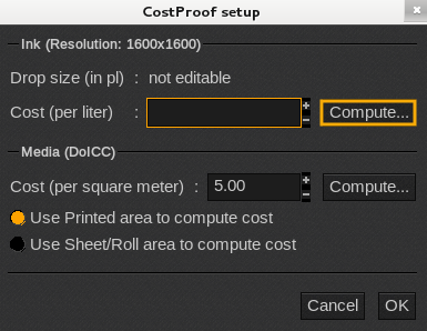 The option CostProof allow to have an estimated printing cost by computing ink and media consuming per job. You can see the cost of your job in a dedicated tab into the Spooler.