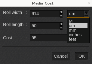 - In the window that appears, first indicate the roll width and choose the unit (M, cm, mm, inches, feet) then type the roll length and choose the corresponding unit followed by the cost.