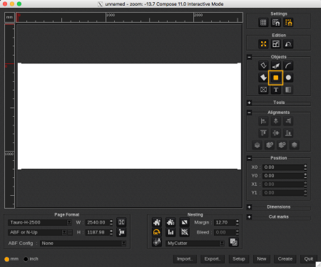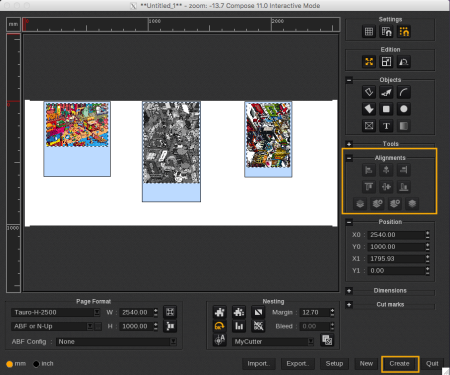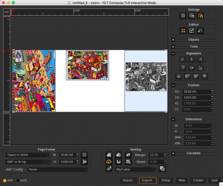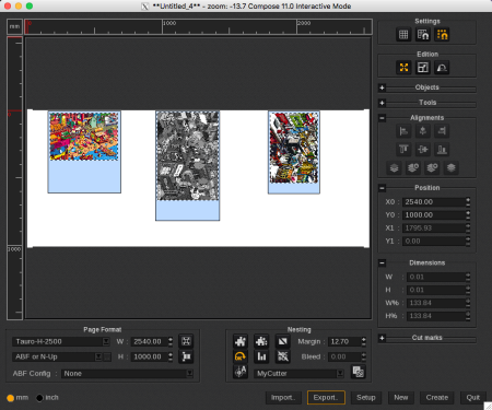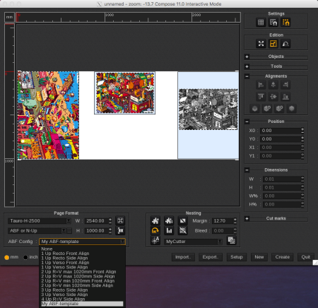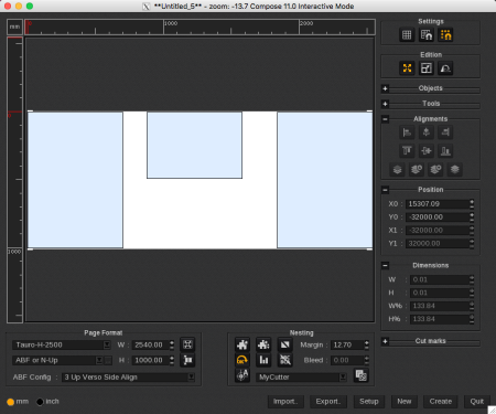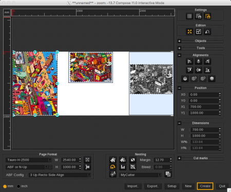 The Tauro-H-2500 engine can operate in either Single Sheet or Multiple Sheet mode. In Multiple Sheet mode, CalderaRIP must send the list of sheets, their sizes, and their precise locations. This document creation is done in the Compose module, following this workflow: