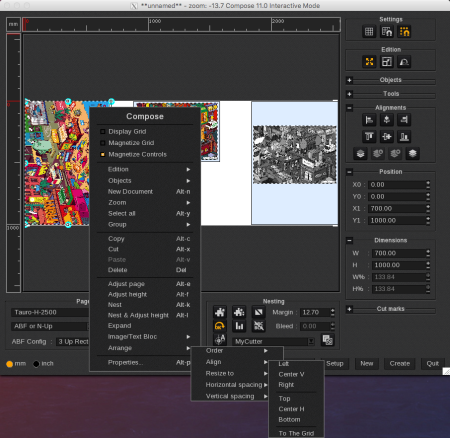 Additionally, remember that sheets must always be top-aligned. There is no visual indicator to show which side is fixed and which is free (this depends on the "ABF configuration"), but you can refer to your printer's operation manual for more information. - Next, drop your files and position them within the sheets. To facilitate sheet placement, you may want to use the buttons in the Alignments area. For instance, to center an image on a sheet, select both the image and the sheet, then click “Center Horizontally” and “Center Vertically.” Additionally, the right-click menu offers other useful functions, such as Arrange, Resize to, and Align: