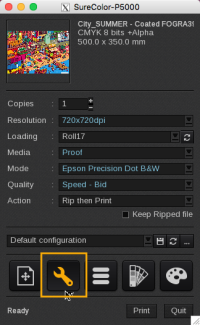 - Save: When you click on this button, the current media settings are saved to the selected media profile (printer, media, resolution, mode) so there will be applied for any new job using the same print configuration. If you don't save, the changes you made are only applied to the current job.