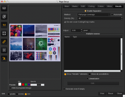 To activate the separation, open Page Setup (the first button at the bottom of the Print Module Interface ) and then open the Metallic tab. Check the "Enable Separation" box and adjust the parameters accordingly. You can then launch the print directly from this window, or close it to continue with the print configuration.