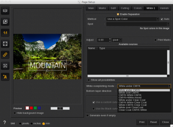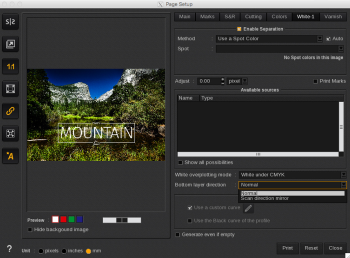 The Page setup window, White tab, allows you to choose the order of layers among: