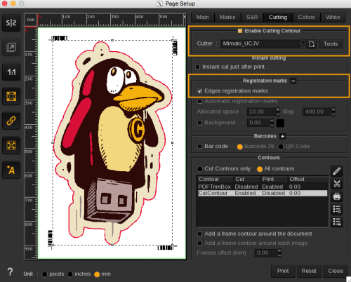 2. On Page Setup > Cutting tab, select the Mimaki UCJV you just installed and enable the Registration marks option. You will note that a bar code is automatically added and will appear in the Preview window: