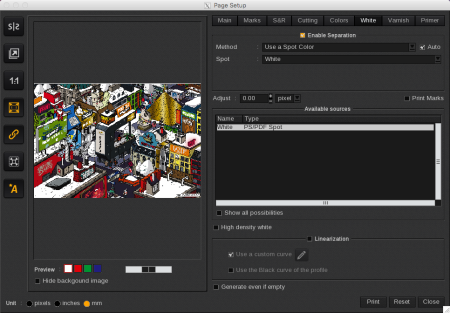 These printers support White, Varnish, and Primer as Spot Inks. To configure them, go to Page Setup > White/Varnish/Primer tab: