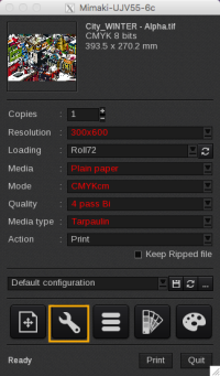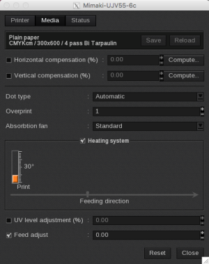 - Save: when you click on this button, the current media settings are saved to the selected media profile (printer, media, resolution, mode) so there will be applied for any new job using the same print configuration. If you don't save, the changes you made are only applied to the current job.