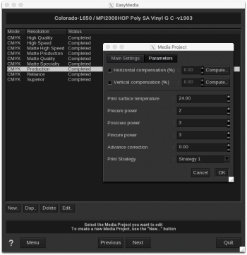 When creating or editing a Media Project, you can set the curing in the Parameters tab. Curing is specific to each Media Project (Mode, Resolution and media).