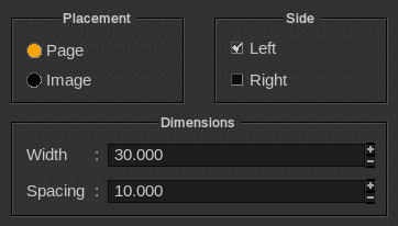 • Dimensions: sets the total Width (for all the inks) and the Spacing between the Color bar and the edge of the page or the image.