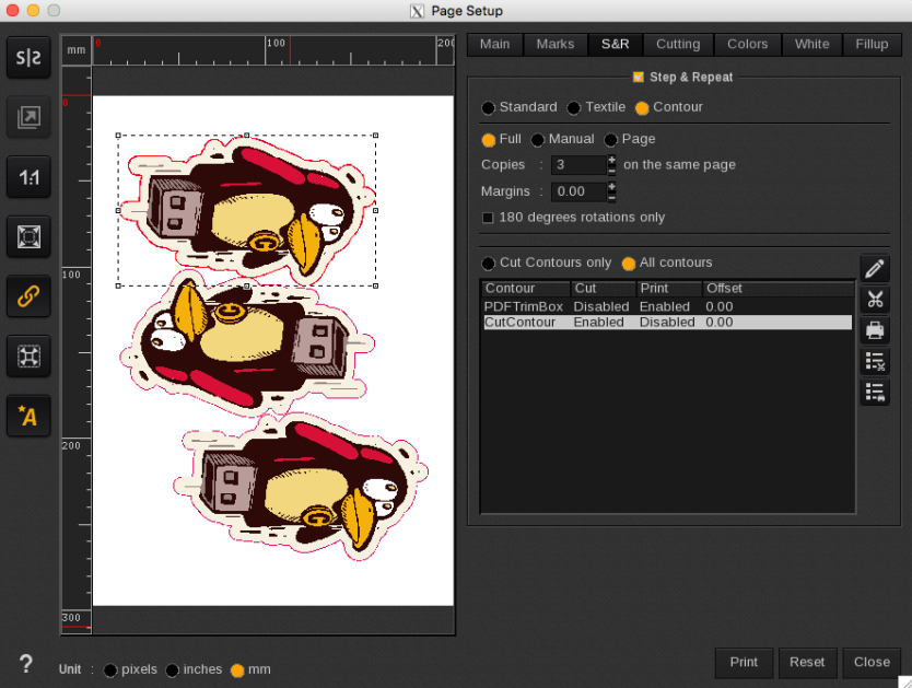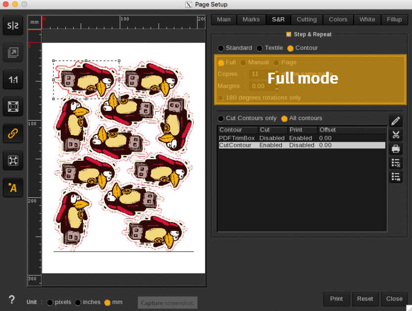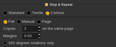 When Contour Step & Repeat is selected, three copy placement options are available: Full, Manual, and Page.