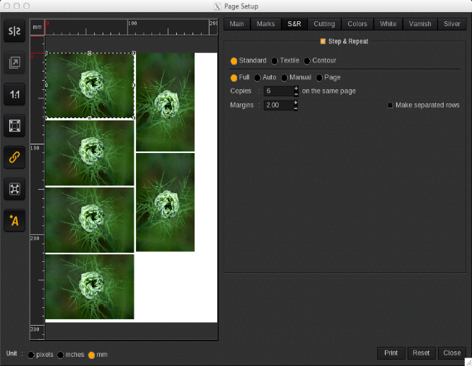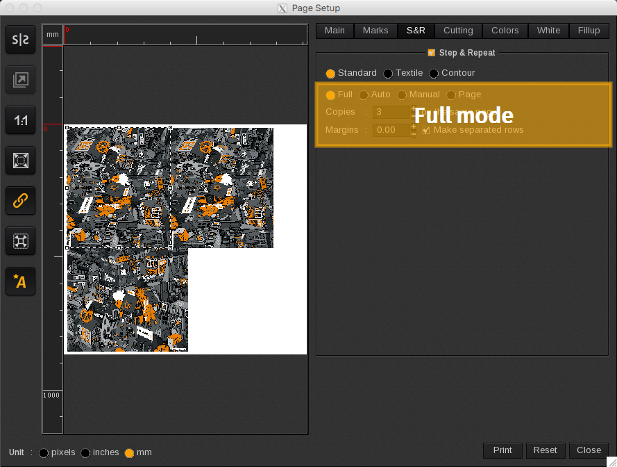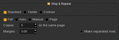 As mentioned when Standard Step&Repeat is selected there are four copy placement options available: Full, Auto, Manual, and Page.