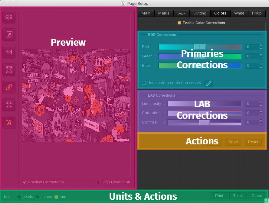 The Colors tab is the last tab listed on the Page Setup window if your printer does not use Spot inks such as Metallic, White, or Varnish. Check the box next to Enable Color Corrections to enable the features on this tab.
