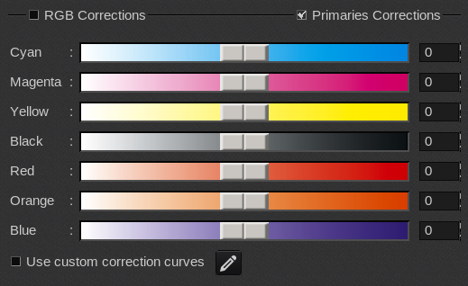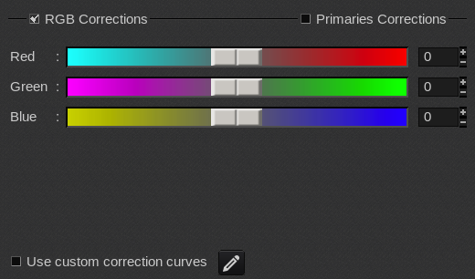 In this area, you can color correct primary colors. To adjust a color, move its cursor to the left or to the right. You can also manually enter a positive or negative value on the far right.