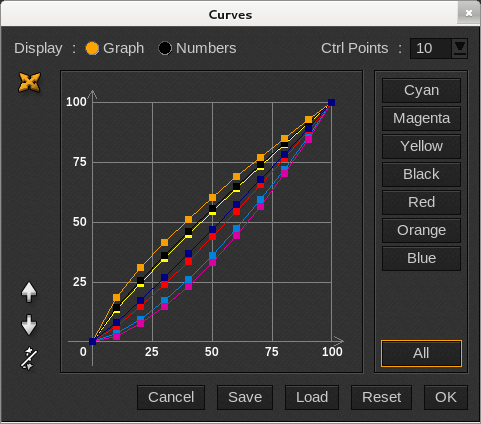 - Cyan, Magenta, Yellow, Black and All: selects the curve(s). When a curve is selected, you can see its control points. In our example all the curves were selected.