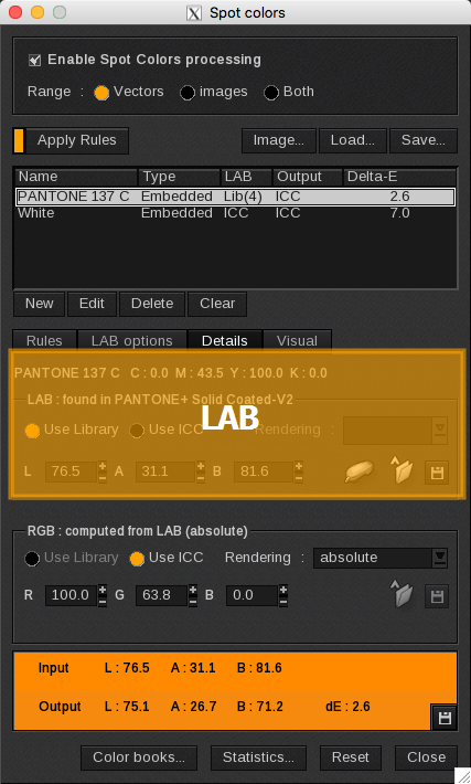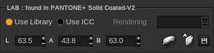 - Use ICC: if the color cannot be retrieved in a library, its LAB value will be computed using the input CMYK values, as if it were a process color.