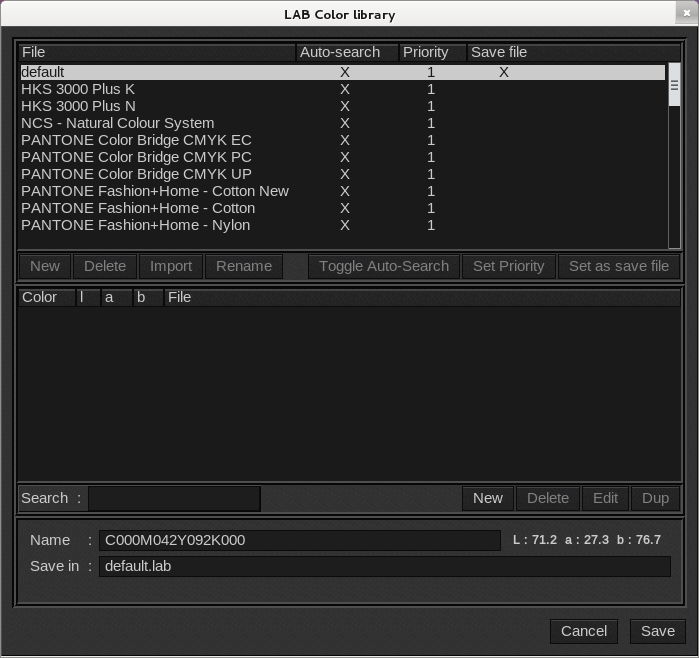 Library icon: opens the LAB Color library window so you can search for a spot color in a specific color library. Select your color library from the File list. Then select the spot color from the Color list. You can use the Search field to help you find the spot color by its name. The New, Delete, Edit and Dup buttons shown below are only available for spot colors that belong to a custom library.